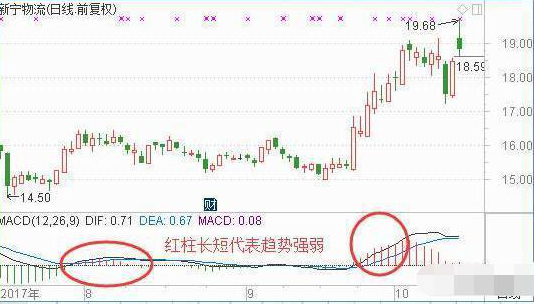 (3)柱状线收缩和放大。一般来说,柱状线的持续收缩表明趋势运行的强度正在逐渐减弱,当柱状线颜色发生改变时,趋势确定转折。但在一些时间周期不长的MACD指标使用过程中,这一观点并不能完全成立。