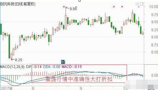 (5)牛皮市道中指标将失真。当价格并不是自上而下或者自下而上运行,而是保持水平方向的移动时,我们称之为牛皮市道,此时虚假信号将在MACD指标中产生,指标DIF线与MACD线的交叉将会十分频繁,同时柱状线的收放也将频频出现,颜色也会常常由绿转红或者由红转绿,此时MACD指标处于失真状态,使用价值相应降低。