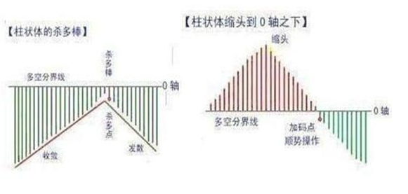 3、杀多棒:杀多棒出现,说明DIF、DEA的距离差将变大,进而12日、26日均线的距离差DIF将变大,K线即将下跌。杀多棒与K线呈同步关系。