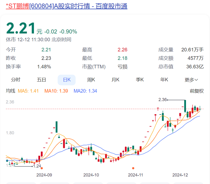 值得注意的是,在连年亏损、面临退市危机的情况下,*ST鹏博还在11月走出一波“8连板”的行情。截至12月12日中午休市,*ST鹏博股价微跌0.9%,总市值36.63亿元。最新财报数据显示,公司拥有股东7.18万户。