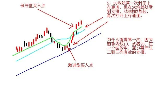 条件1、均线处于上升中,2、 5、10均线第一次封闭通道下行,K线在20均附近止跌。