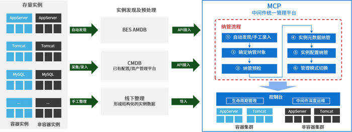 为了应对这一痛点,宝兰德适时推出的中间件统一管理平台2.0(BES Middleware Cloud Platform,简称MCP)全面强化了存量中间件实例的纳管能力,无论客户现场存在何种类型、版本或部署模式,均可以自动化步骤极大的简化纳管过程,无缝对接拉通中间件新建和存量纳管场景,被纳管实例可以丝滑融入平台已有的管理能力。