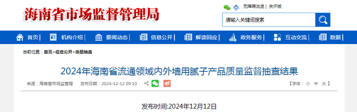 2024年海南省流通领域内外墙用腻子产品质量监督抽查结果公布