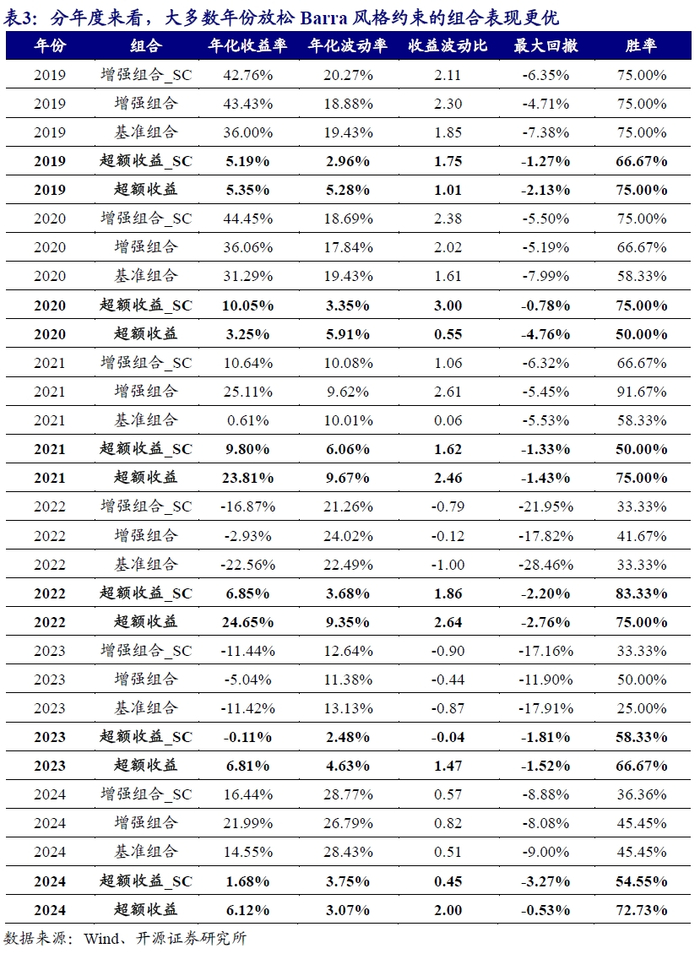 分年度来看(2024年数据截至11月30日),Barra风格完全放松的增强组合,其超额收益仅在2020年白马蓝筹股为主导的行情下跑输Barra风格严格约束的增强组合,其他年份均具有显著的超额收益表现。鉴于此,从长期角度,我们认为用短期波动换取长期收益是可行的投资策略。