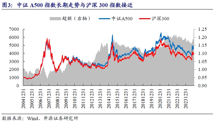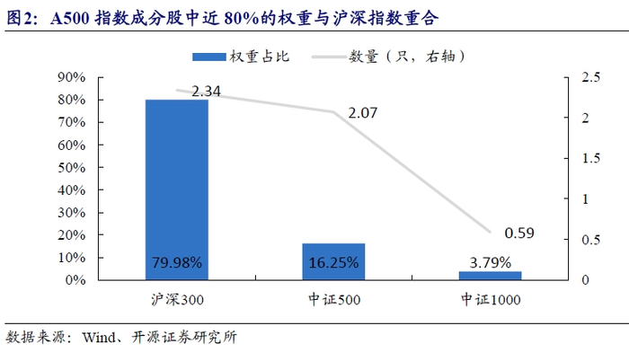 以2024年9月份首次披露的A500指数成分股明细为例(如无特别说明,下文均以此为比较基准),A500指数成分股中包含234只沪深300成分股,207只中证500成分股以及59只中证1000成分股。其中,所含沪深300成分股权重合计占比近80%,这导致中证A500指数与沪深300指数走势高度近似。