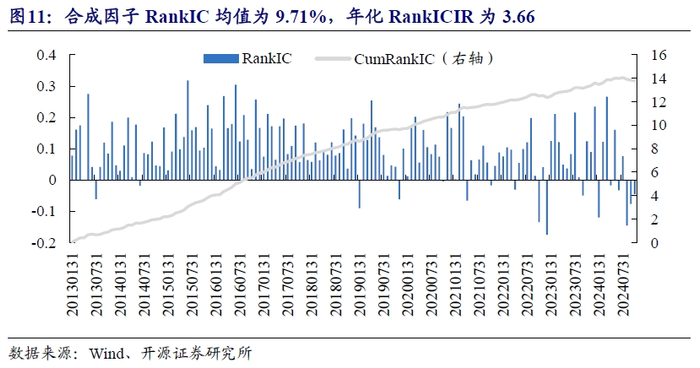 我们尝试将上述细分因子进行等权合成,市值行业中性化处理后的合成因子表现相对单因子有明显提升。测试期内市值行业中性化后的合成因子RankIC均值为9.71%,年化RankICIR为3.66。不过近一年时间,合成因子预测胜率有所下滑。