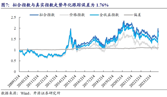 由于前期中证行业分类信息不可获取,我们将指数拟合的回溯开始时间递延到2009年下半年的调样时点。拟合指数的净值走势基于每个调样点的成分股权重进行收益率加权计算得到。从拟合的净值走势来看,拟合误差处于较小范围之内,年化跟踪误差约1.76%。