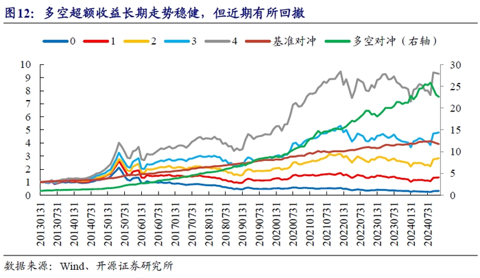 从分组收益来看,合成因子多空超额和多头相对市场平均收益的超额近期受制于市场风格的大幅切换,均呈现出较明显回撤。