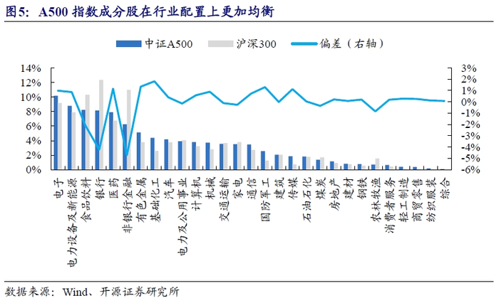 从行业分布来看,A500指数成分股在银行、非银金融和食品饮料等行业上的配置比例相比沪深300指数有显著下降,而对应新质生产力方向的行业如电子、电力设备等行业则相对沪深300指数高配。