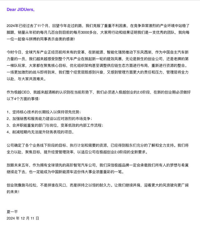 12月11日,极越汽车CEO夏一平在内部信承认公司遭遇困难需要立即调整。当晚,极越已有多部门宣布就地解散,国内多个城市的门店暂停营业。极越汽车多家供应商也陷入焦虑,在线讨要被拖欠的款项。