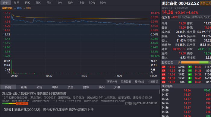 12月12日,湖北宜化的股票开盘一度涨停,截至收盘,该股报14.36元/股,涨幅4.66%,成交量136.7万手,成交额20.14亿,主力净流出2.11亿,总市值155.5亿元。