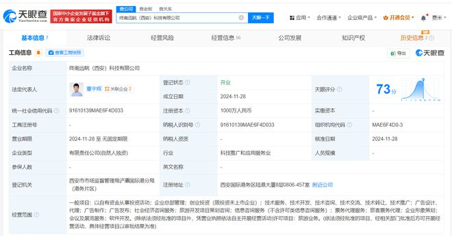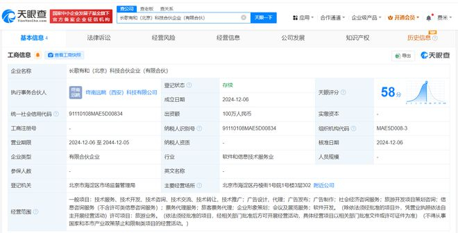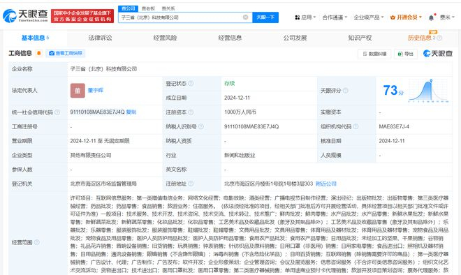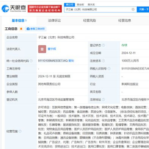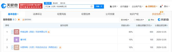 每经AI快讯,天眼查App显示,近日,子三省(北京)科技有限公司成立,法定代表人为董宇辉,注册资本1000万元人民币,经营范围含互联网信息服务、第一类增值电信业务、网络文化经营、电影放映、酒类经营、广播电视节目制作经营等。股东信息显示,该公司由终南远眺(西安)科技有限公司、董宇辉、长歌有和(北京)科技合伙企业(有限合伙)共同持股。值得一提的是,终南远眺(西安)科技有限公司、长歌有和(北京)科技合伙企业(有限合伙)均于近期成立,注册资本分别为1000万元人民币、100万元人民币。