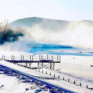 随着太阳升起,呼玛河河面雾气缭绕,沿岸的雾凇美景吸引了许多游客和当地摄影爱好者驻足拍照。