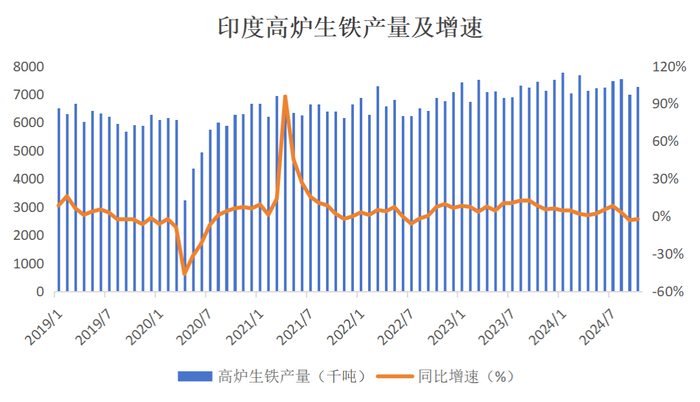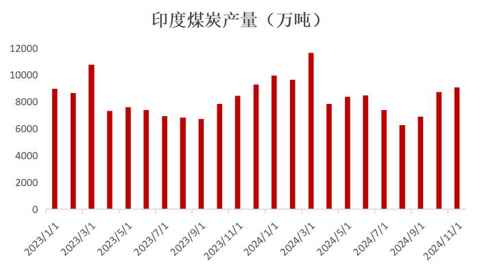 根据世界钢铁协会预测,印度钢铁需求或将保持较高增速,预计将在2024年和2025年分别呈现8%和8.5%的增速;2024年1-10月印度生铁产量累计同比增速达到2.3%,继续呈现稳定增长态势,预计未来对澳煤等进口焦煤仍有增量需求;