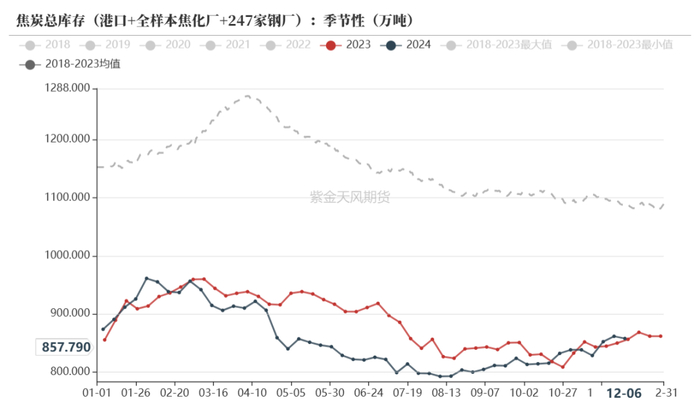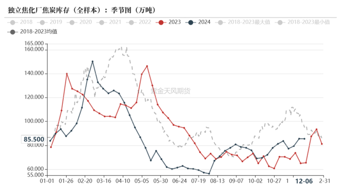 焦炭作为中间产品总库存相对偏低,整体库存结构好于焦煤,上游焦化厂库存同比偏高,钢厂在全年多数时间保持低库存策略,到11月下旬开始有冬储备货行为;