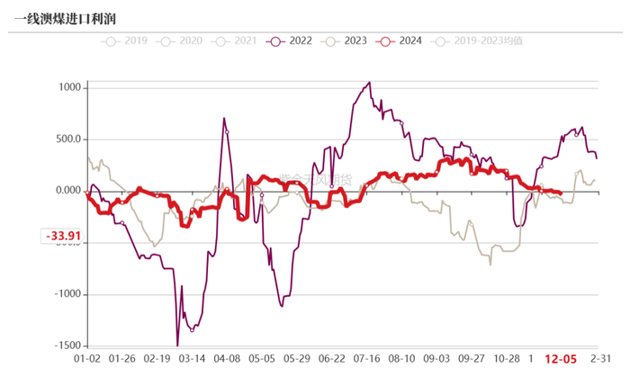 25年来看澳煤进口量仍需关注进口性价比变化,目前进口利润倒挂,预计25年进口量减100万吨至700万吨以下。