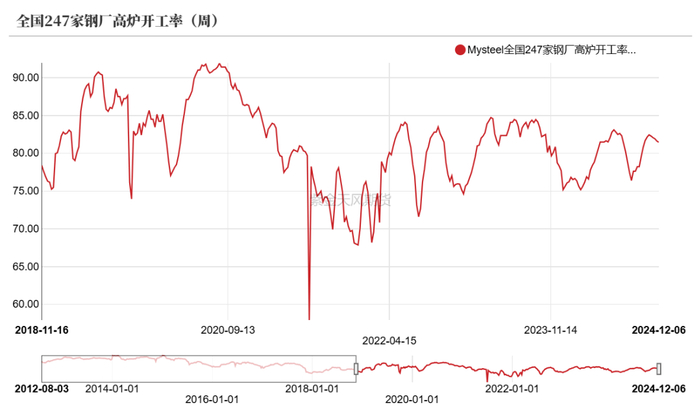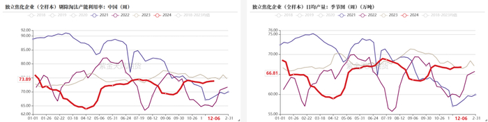 今年全年独立焦化产能利用率均值约在71%,相比去年均值75%有所下滑,主要是受到低利润及弱需求的压制,预计25年焦化开工保持重点偏低水平。