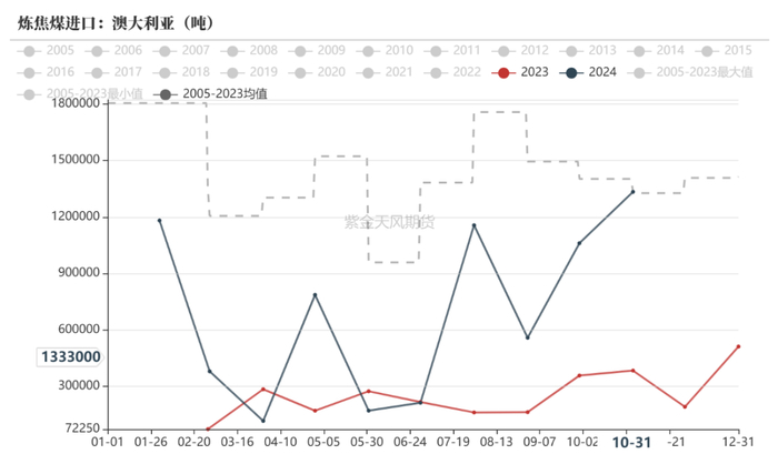 2024年1-10月澳煤进口量呈现大幅增长,主要是由于海外需求低迷以及澳煤进口利润窗口阶段性打开;