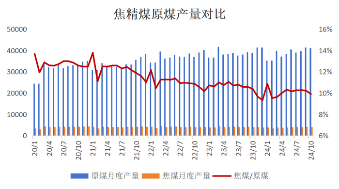 全年焦煤产量呈现前低后高,后续常态化安监对供应端影响较小,而矿端生产对于弱需求的调节速度较慢,短期看年底前可能由于天气、完成产量目标等原因出现季节性减产,但长期看预计25年焦煤产量能给保持类似今年下半年的偏高水平。