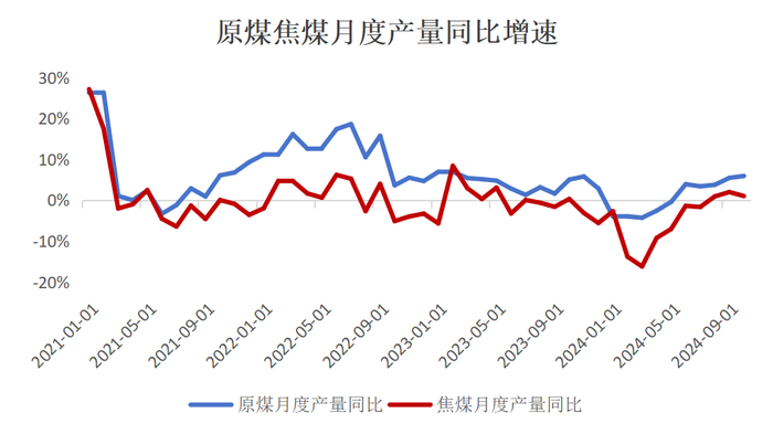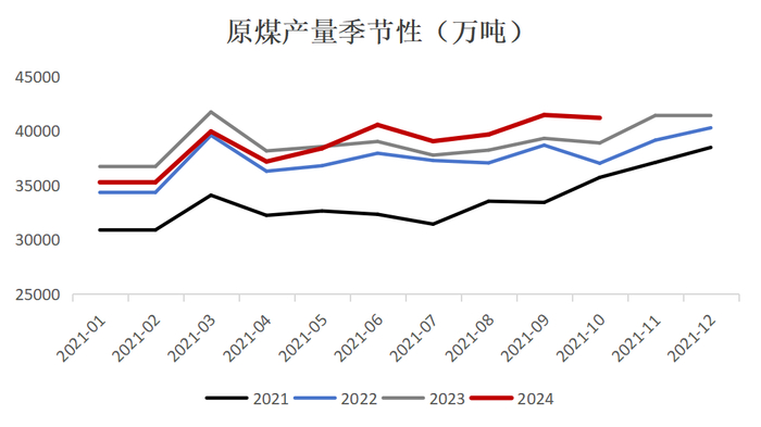 2023年下半年至今年初,煤矿安全监管均对煤炭产量、产能释放形成扰动;而在今年3月,国家能源局印发的《2024年能源工作指导意见》中明确了2024年全国能源生产总量目标,将煤炭的稳定增产被视为保障能源供应的重要一环;5月31日,国务院安全委办公室对山西矿山的安全生产帮扶指导工作“回头看”阶段结束,6月生产安全月结束后,下半年原煤复产速度明显提升,8月后原煤年内累计产量开始超过去年,多数煤矿保持稳定高位开工。