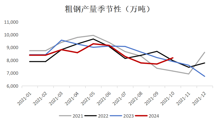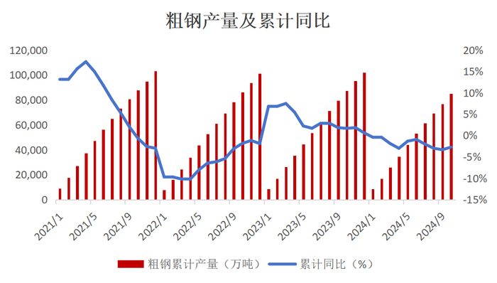 国家统计局数据显示,2024年1-10月,中国粗钢产量85073万吨,同比-3%;生铁产量71511万吨,同比-4%;