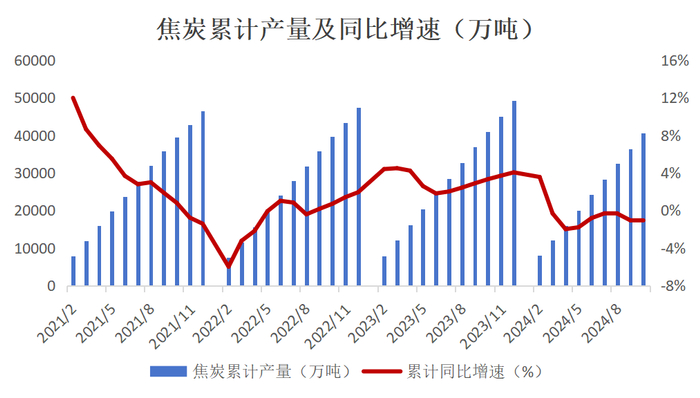 统计局数据显示,2024年1-10月我国焦炭产量累计约为40570.8万吨,同比-1.1%;