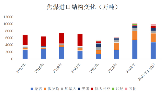 从进口结构来说,仍是“蒙煤+俄煤”为主的进口格局,海运煤占比有所提升;1-10月我国分别由蒙古和俄罗斯进口焦煤4735万吨和2563万吨,约占焦煤总进口量的75%,而其他主要进口国依次为美国、加拿大、澳大利亚、印尼;焦煤进口压力大,在国产煤复产的下半年表现得尤为明显。
