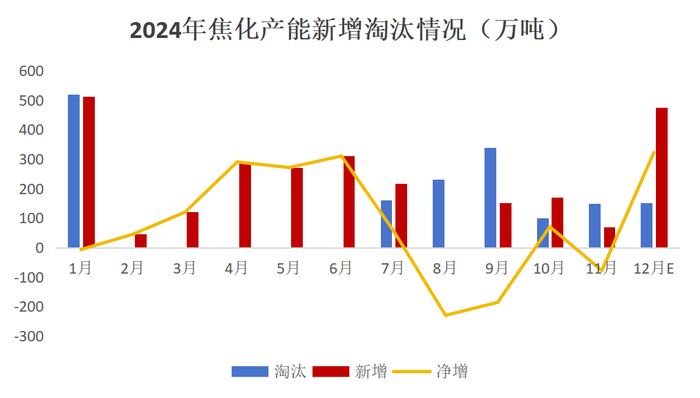 截至11月底,2024年已淘汰焦化产能1496万吨,新增2158.5万吨,净新增662.5万吨;预计2024年淘汰焦化产能1648万吨,新增2632.5万吨,净新增985万吨;目前全国焦化产能总计在5.65亿吨水平;