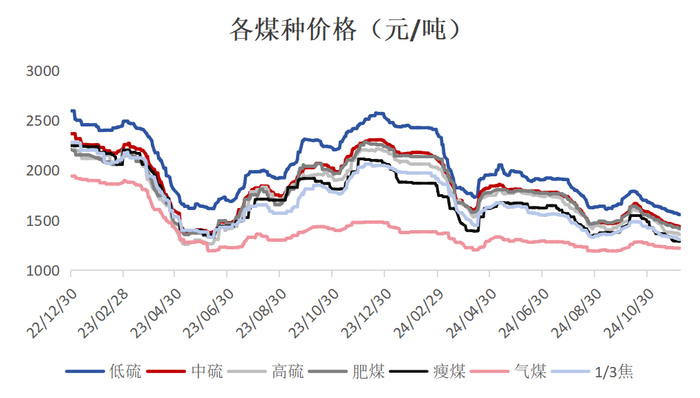 需求端:2024年预计焦煤国内消费约5.83亿吨,同比约-2.6%,全年消费表现较弱;今年生铁、粗钢产量下跌,焦炭产量下跌,下游焦钢企全年对焦煤保持低库存策略,焦煤表现为刚需较弱、投机性需求缺失,明年在政策刺激下预计需求有所回暖,预计25年焦煤消费5.92亿吨,同比增长1.4%;出口方面预计无较大变化。