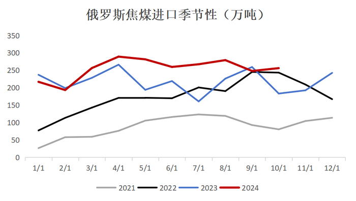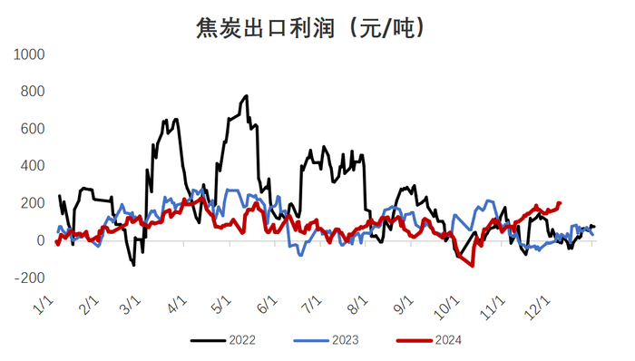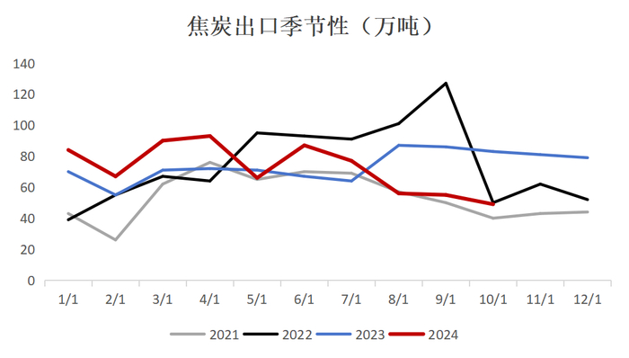 从价格来看,9-10月我国焦炭共提涨六轮,出口利润明显压缩,而我国低价钢材直接出口也降低了国外对原料的采购意愿,因此8月-10月我国焦炭出口量明显降低;后期来看,海外宏观波动较大,市场观望情绪浓厚,预计年底出口订单延续偏低50-60万吨水平;而25年考虑我国焦炭价格可能性价比较好,出口有韧性,预估小幅增至870万吨水平。