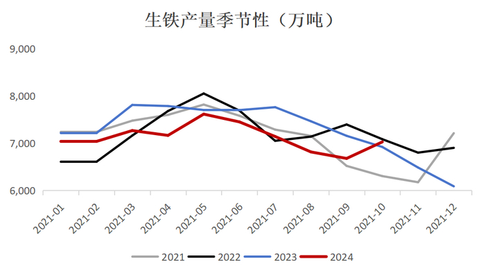 今年整体市场悲观,钢厂盈利及开工整体偏低,目前铁水处于季节性下滑阶段,预计全年生铁产量-3%;明年预计政策刺激可能导致基建粗钢需求转正,房地产降幅明显收敛,因此预计25年生铁产量增长+1%左右。