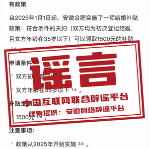 真相:近日,有网民发布消息称“自2025年1月1日起,安徽合肥实施结婚补贴政策”“初次结婚登记可以领取1500元补贴”“下载相关APP即可领补贴款”,引发关注。对此,合肥市民政局发布声明称,网传消息为谣言。合肥市并未研究、出台有关结婚登记的补贴政策,望广大网民注意甄别。(来源:“安徽省互联网违法和不良信息举报”微信公众号)