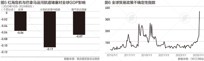 OECD编纂的“全球贸易不确定性”指数则在2025年后急速拉升。OECD认为,这反映了贸易紧张局势加剧和保护主义风险上升、地缘政治冲突的可能升级以及某些国家的财政政策面临挑战等风险不容忽视。“在过去几十年里,贸易一直是全球经济增长、创造就业机会和减少贫困的重要引擎。而贸易政策的不确定性和地缘政治紧张局势的加剧,可能会对全球经济增长产生负面影响。此外,全球供应链的中断和技术进步的放缓也可能给全球经济增长带来不利影响。”