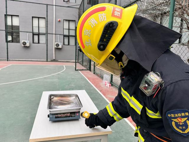 消防员用测温枪测试卡式炉气瓶仓的温度。