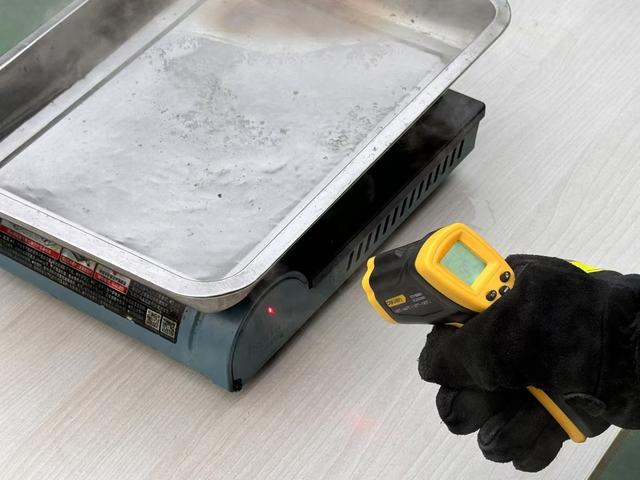 实验中,消防员在室外场所准备了两个卡式炉,其中一个的锅具尺寸合适,另外一个的锅具尺寸过大。点火5分钟后,消防员用测温枪测试发现,两个炉具气瓶仓的温度相差不大,一个51摄氏度,一个62摄氏度。然而,点火15分钟后,前者的温度稳定,变化不大,后者因为锅具过大,气瓶附近的温度持续上升,最高时超过90摄氏度。