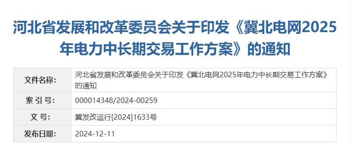 河北省发展和改革委员会关于印发《冀北电网2025年电力中长期交易工作方案》的通知