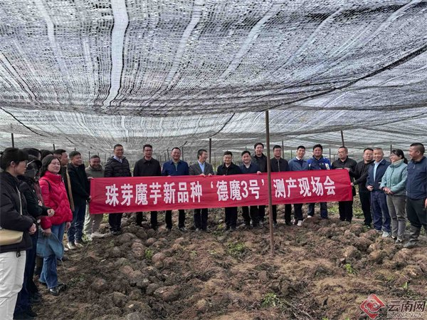 该示范基地位于德宏州陇川县景罕镇曼面村。专家组现场考察,听取汇报,并随机选取4个样点开展实收测产。专家组一致认为,珠芽魔芋新品种“德魔3号”在生产中获得成功,该品种具备抗病性好、产量高等特点,是珠芽魔芋适生区主推品种,适合海拔700—1200米区域种植,适宜50%遮阴网荫蔽种植,或与玉米、经济林果间套种,经济效益可观。 云南农业大学陈军文教授指出,魔芋产业链长,附加值高,是21世纪的朝阳产业。我省魔芋种质资源丰富,拥有国际国内两个市场、两种资源,魔芋产业发展优势明显。“德魔3号”抗病性强、产量高、品质好,有望成为云南热区珠芽魔芋主栽品种。