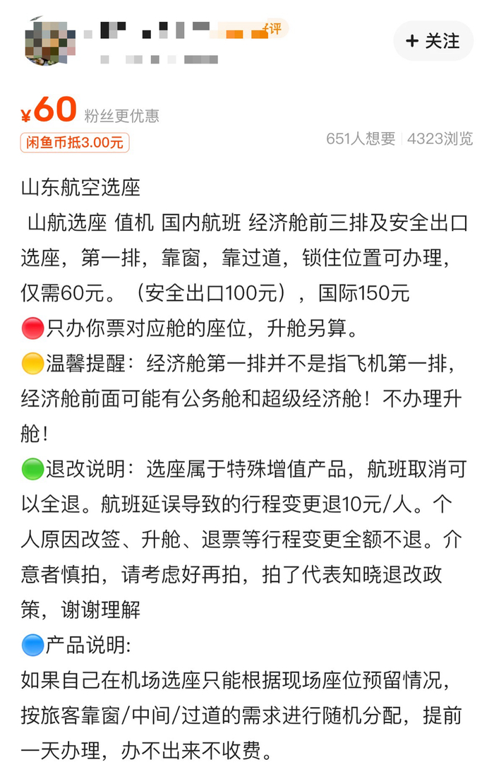其中,一位叫“山航升舱专业户”的网友写到,“可办理航班选座服务,第一排靠窗靠过道60元,安全出口100元,国际150元。”有消费者留言,“非常好帮订票还给截图,很靠谱!”李某表示,当前部分航司在选座规则上并未做到合理、透明,座位管理和消费者体验也没有做到平衡。