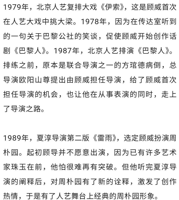 顾威,1940年出生,1963年毕业于中央戏剧学院表演系。毕业之后,先是去了北京市农村文艺工作队,1969年进入北京人艺,任演员、导演,曾任北京人艺艺委会委员。