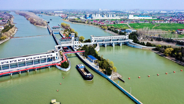位于江苏省扬州市江都区的南水北调东线一期工程运盐闸、邵仙套闸、邵仙闸洞(2024年3月19日摄,无人机照片)。新华社发(任飞摄)