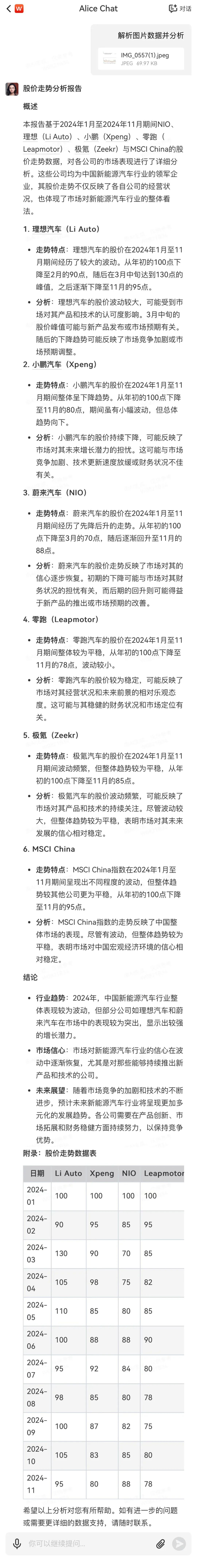 中汽协最新数据出炉,新能源汽车市占率飙升至45.6%,这意味着每卖出两辆新车,就有一辆是新能源的!这个数字不仅是一个里程碑,更是市场竞争加剧的信号。就让我们借助Alice的图片解析能力,通过分析股价变化以洞察市场竞争的态势。