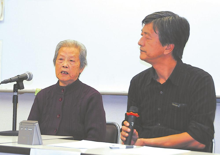 艾义英(左)在日本大阪参加证言集会,讲述自己在南京大屠杀中的亲身经历(2014年12月7日摄)。