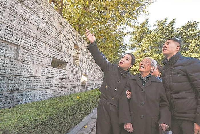 1日,南京大屠杀幸存者艾义英(右二)和家人在南京大屠杀遇难同胞纪念馆的“哭墙”上寻找家人姓名。