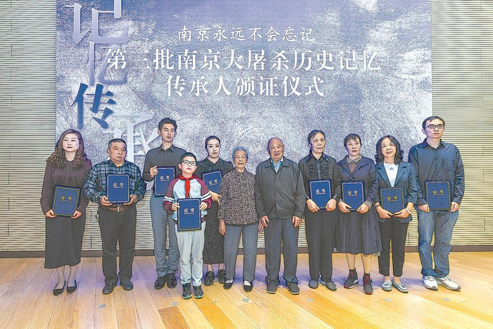 2024年10月11日,第三批南京大屠杀历史记忆传承人颁证仪式在侵华日军南京大屠杀遇难同胞纪念馆举行。这9名传承人来自8个幸存者家庭,年龄最大的68岁,最小的9岁。