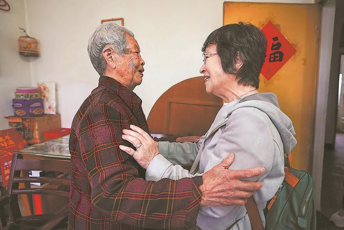 日本铭心会会长松冈环在南京看望艾义英(左)(2024年4月5日摄)。