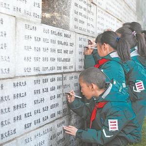 1日,参加南京大屠杀死难者家庭祭告活动的小学生用黑笔给“哭墙”上的名字“描新”。