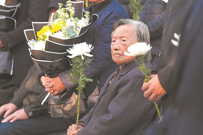 12月1日,阳光透过松柏枝叶洒落在侵华日军南京大屠杀遇难同胞纪念馆一角的“哭墙”上。95岁的夏淑琴来到南京大屠杀死难者家祭活动现场。“又一年了,我来看看你们。”老人说。