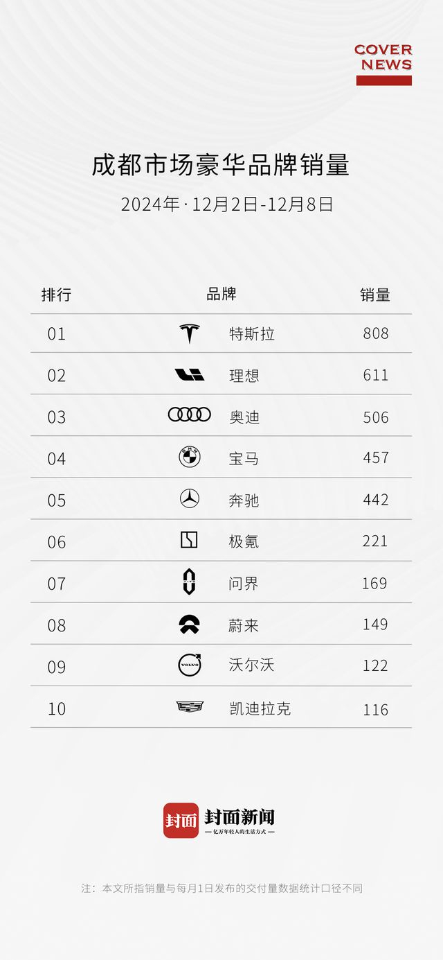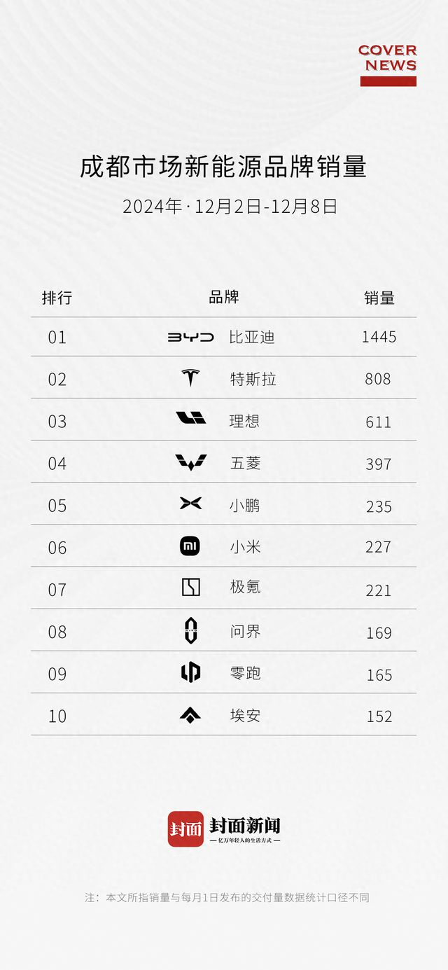 最新!成都汽车销量榜:比亚迪、特斯拉、理想断层领先,凯迪拉克挤掉雷克萨斯进入前十
