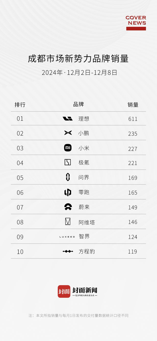 最后,在成都市场新势力品牌销量榜上,理想、小鹏、小米、极氪四大品牌的周销量均超过了200辆,占据榜单前四,位居5-10位的依次为问界、零跑、蔚来、阿维塔、智界、方程豹。其中,随着智界S7、方程豹豹8等新车型的加入,智界、方程豹两大品牌,已连续多周进入前十榜单,值得关注!