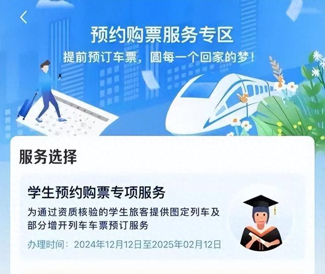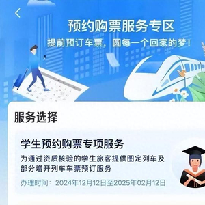 自12月12日起,铁路部门在铁路12306手机客户端开启学生预约购票服务专区,同时优化调整学生优惠票发售和查验规则,符合条件的旅客朋友可通过专区预约购买春运期间往返车票,学生旅客春运出行将更加便利。
